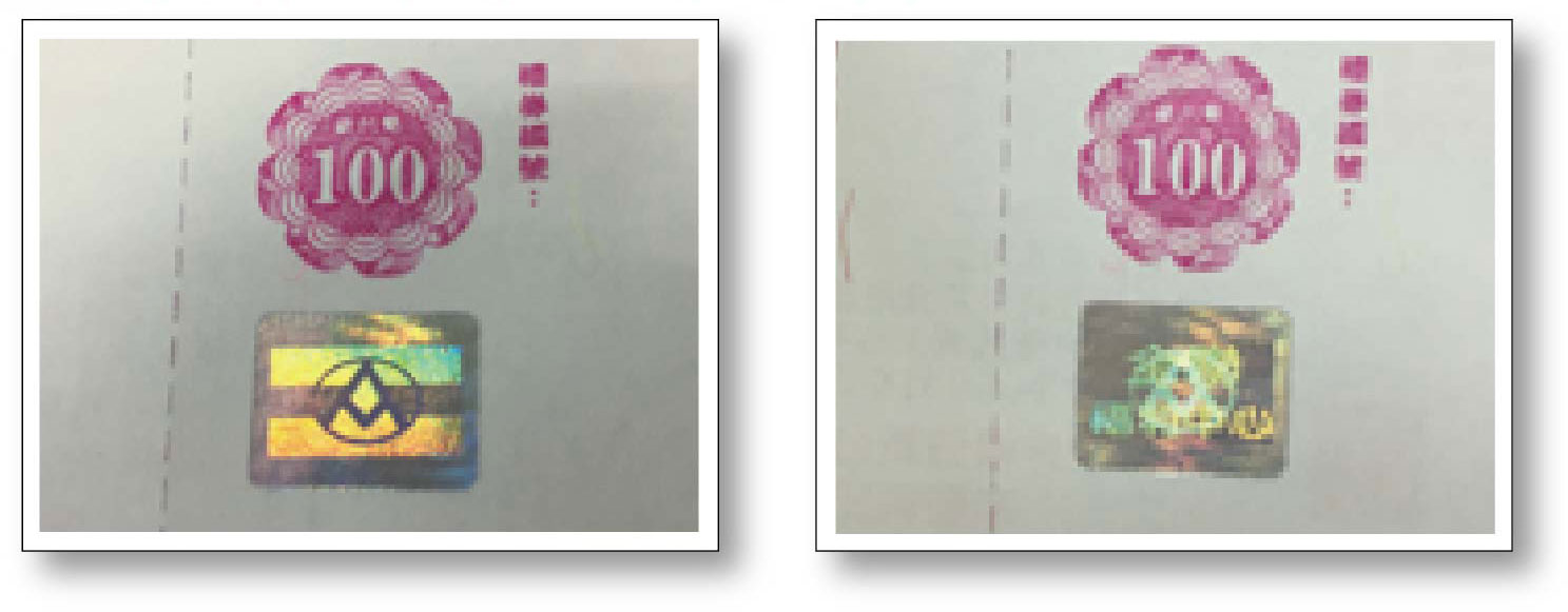 雷射全影像對位燙金,特性為雷射影像層次豐富生動,不同角度會有不同的光影變化,此技術不易變造,容易辨認,若要仿造必須投入非常高額的成本,用於大量流通的有價及重要票證上,例如Passport(護照)、Entry Visa(入境簽證)、ID Card(身分證)、Credit Card(信用卡),全聯禮券的防偽燙金屬於此一等級。