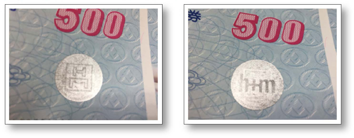 印刷影像對位燙金,特性為結合印刷時冷裱金箔,達到燙金影像與印刷圖像對位效果,但其燙金影像無層次變化較易仿照,超商集點貼紙採用此種技術。