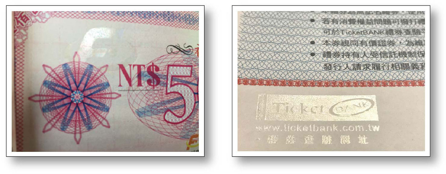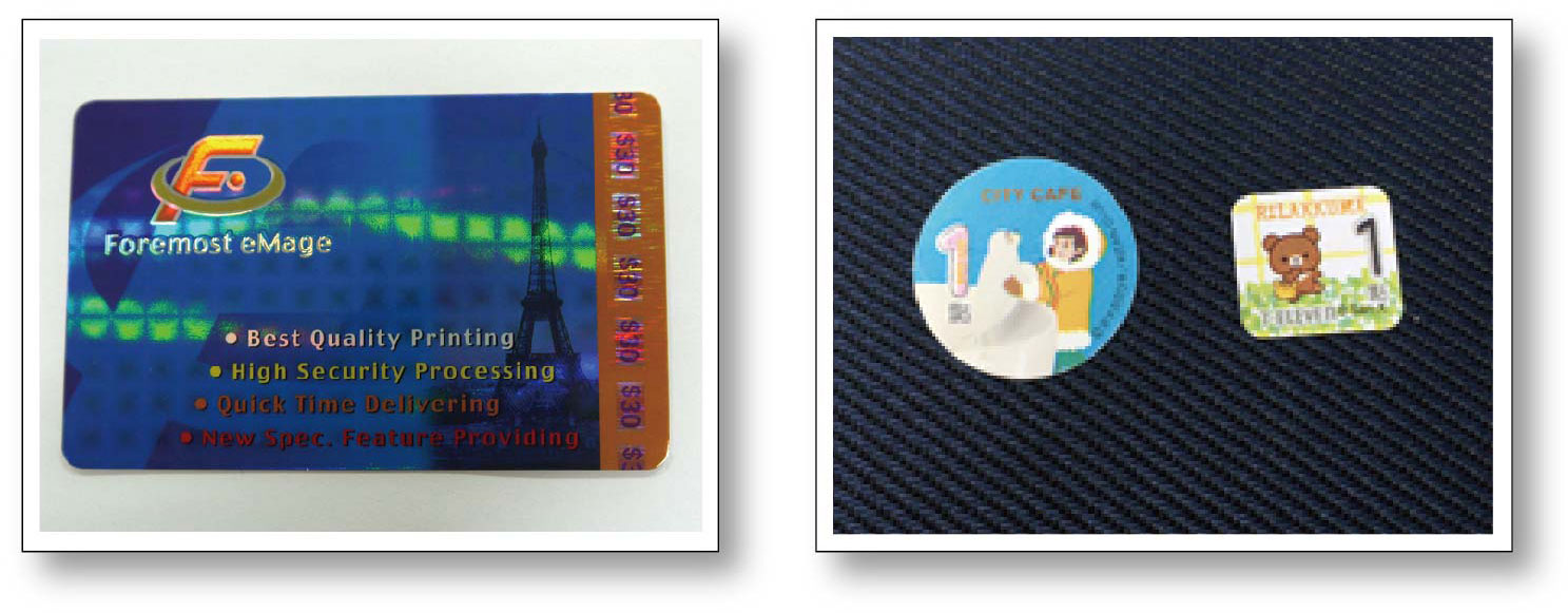 影像燙金,使用特殊雷射燙金膜,燙印企業LOGO的圖像或文字,目前微量發行的商品禮券、餐券、住宿券、門票(入場券)等,採用此種技術。